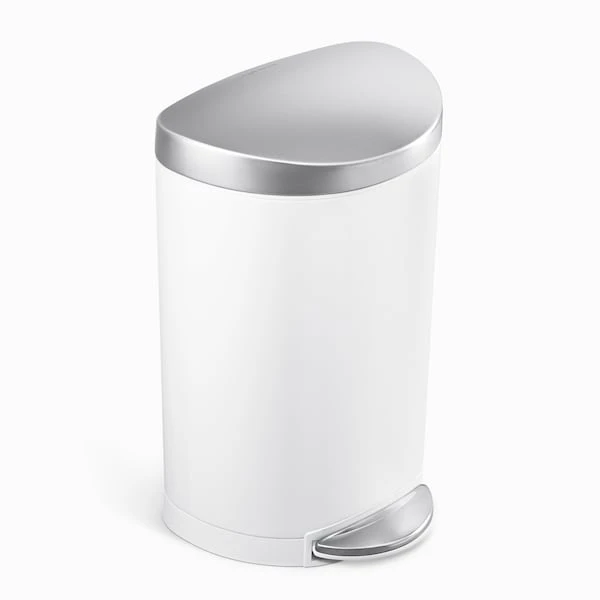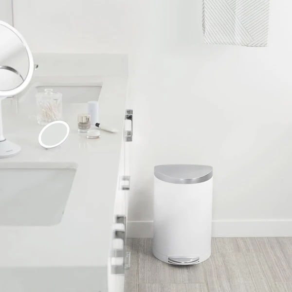 The simplehuman space-efficient semi-round step can is perfect for smaller spaces like a bathroom or an office. The strong steel pedal is built to last, and lid shox technology ensures a smooth, silent close every time. A removable inner bucket makes for easy trash disposal. The code C liner fits this can perfectly — no bunching or slipping for a cleaner trash experience.
