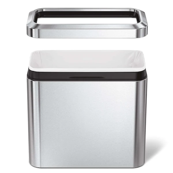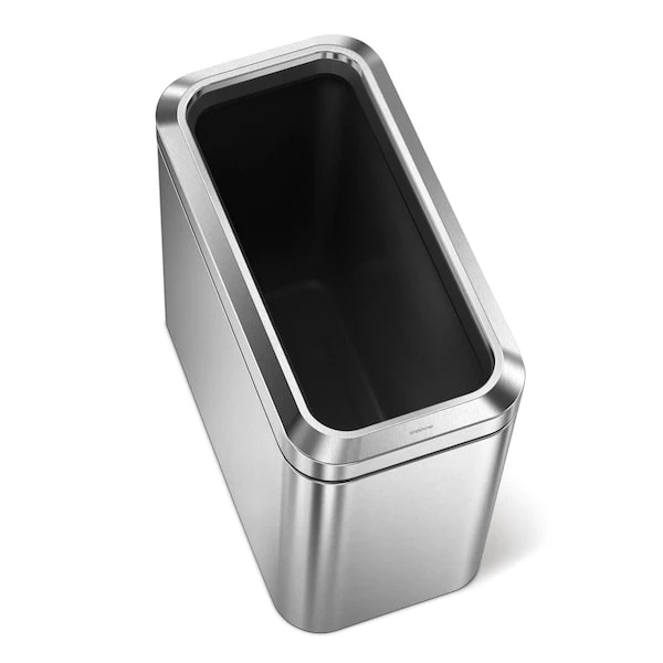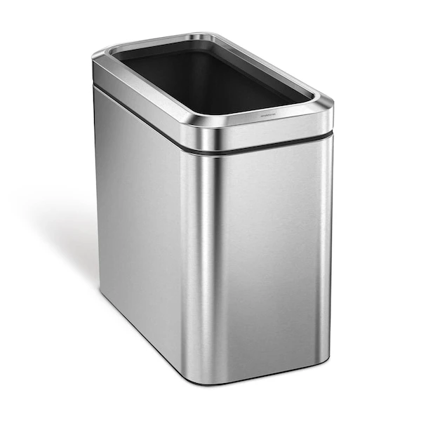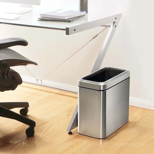 The simplehuman slim open can has a narrow, space-efficient shape that is perfect for hotel rooms or offices. A lift-off lid makes it easy to change the liner, and sturdy stainless steel construction will ensure this can lasts a long time even in tough environments. ADA-compliant. The code F liner fits this can perfectly — no bunching or slipping for a cleaner trash experience.