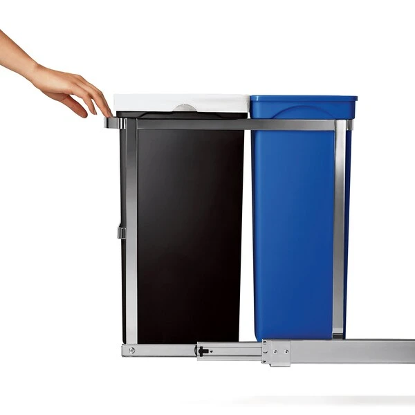 Keep trash and recyclables neatly sorted and concealed inside the cabinet. The simplehuman twin-bucket, easy-to-install pull-out recycler glides out of the cabinet on smooth commercial-grade ball-bearing tracks for quick and easy access. The code D and G liners fit this can perfectly — no bunching or slipping for a cleaner trash experience.