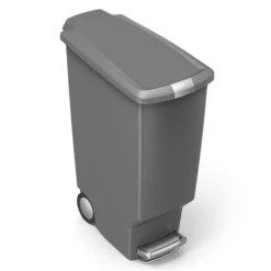 The slim plastic step can has a space-efficient shape that fits perfectly in tight spaces, like between cabinets. The strong steel pedal is designed to last, and patented lid shox technology ensures a smooth, silent close every time. A slide lock helps keep trash in and pets and curious children out. The code K liner fits this can perfectly — no bunching or slipping for a cleaner trash experience.