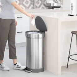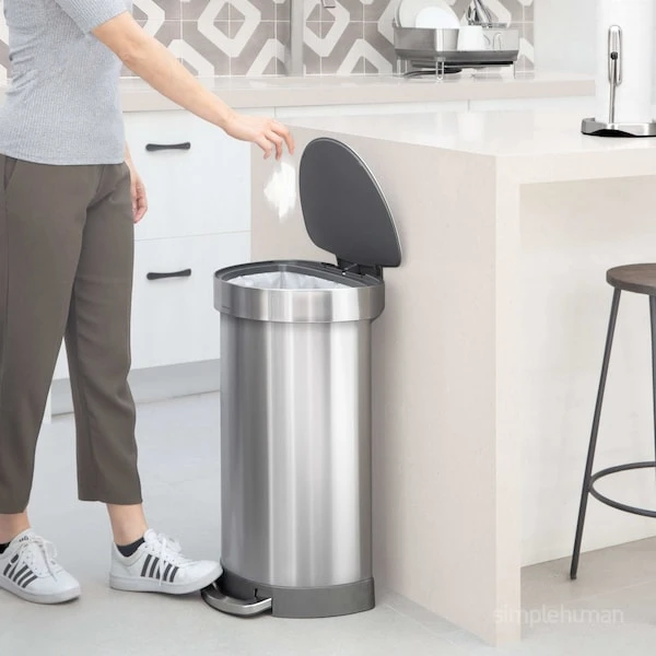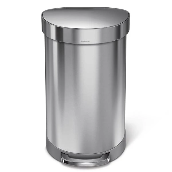 The simplehuman semi-round step can has a flat back for easy placement against the wall and out of the way. Its large capacity is ideal for busy areas around the home. The liner rim lifts up for easy access to the liner, then closes to grip and keep it neatly out of sight. The strong steel pedal is built to last, and lid shox technology ensures a smooth, silent close every time. The code J liner fits this can perfectly — no bunching or slipping for a cleaner trash experience.