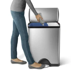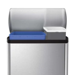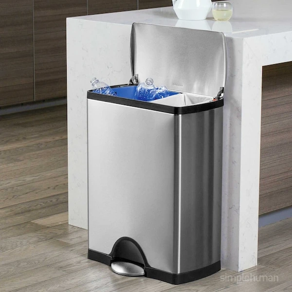 The simplehuman rectangular recycler has two inner buckets and a space-efficient shape that make it easy to separate trash and recyclables in one place. The strong steel pedal is designed to last, and patented lid shox technology ensures a smooth, silent close every time. The code H and V liners fit this can perfectly — no bunching or slipping for a cleaner trash experience.