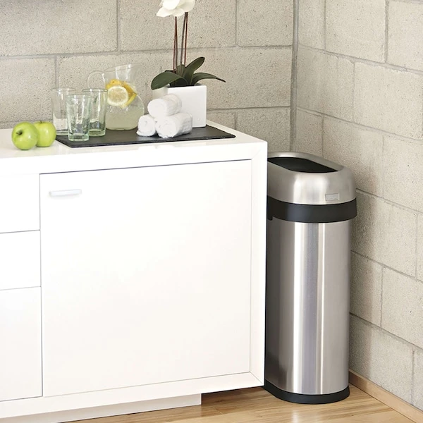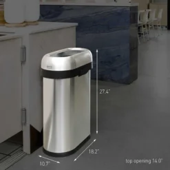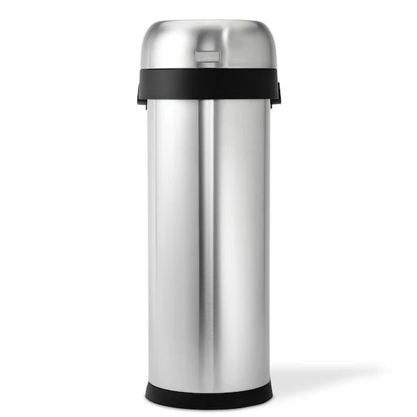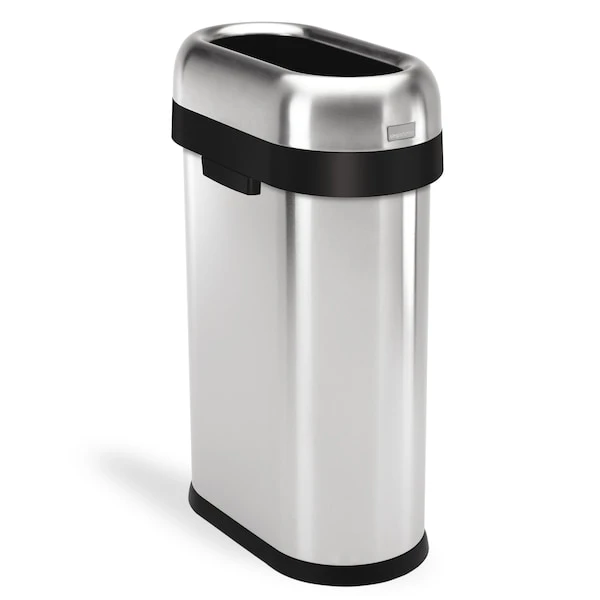The simplehuman slim open can has a space-efficient shape designed for tight spaces, while its open lid makes it easy to toss in trash on the go. The heavy-gauge stainless steel construction, lift-off lid, and large capacity make it an ideal choice for for busy, high-traffic areas such as restaurants, coffee shops, and hotel lobbies. ADA-compliant. The code N liner fits this can perfectly — no bunching or slipping for a cleaner trash experience.