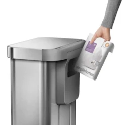 The simplehuman stainless steel rectangular step can features an innovative ‘liner pocket’ that stores and dispenses liners from inside the can for a faster liner change. The stainless steel liner rim grips the liner and keeps it hidden. And with no inner bucket, there’s more space for trash. Strong wide steel pedal is designed to last, and patented lid shox technology ensures a smooth, silent close every time. Code Q liner refill packs store perfectly in this can’s liner pocket.