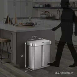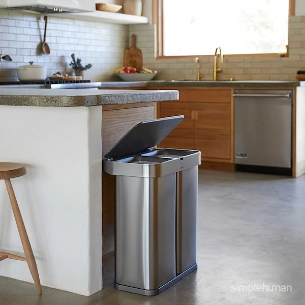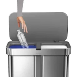 The simplehuman dual compartment rectangular sensor can with voice control opens at the sound of your voice. Just say, ‘open can’ and the lid opens automatically, so throwing trash away is quick, efficient and hassle-free. You can also say, “stay open” while performing longer chores or cooking, and the lid won’t close until you say, “close can” (or it will close automatically after 10 minutes). It also has a motion sensor that opens the can with a wave of your hand and is smart enough to adapt to you and the surrounding environment — no false triggers, no unexpected lid closures. Dual compartments make it easy to neatly sort your trash and recyclables in one convenient, space-efficient place. On one side, it features an innovative ‘liner pocket’ that stores and dispenses liners from inside the can for a faster liner change. The other side has a convenient handled bucket for easy lifting and disposal of all your recyclables. The liner rim lifts up for easy access to the liner, then closes to grip and keep it neatly out of sight. The can’s stainless steel surface is protected by an invisible fingerprint-proof coating that is also infused with Agion®, an EPA-registered antimicrobial that inhibits the growth of bacteria, fungi, mold, and mildew. ADA-compliant.