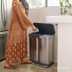 The simplehuman dual compartment stainless steel rectangular step can makes it easy to neatly sort your trash and recyclables in one convenient, space-efficient space. On one side, it features an innovative ‘liner pocket’ that stores and dispenses liners from inside the can for a faster liner change. The other side has a convenient handled bucket for easy lifting and disposal of all your recyclables. The stainless steel liner rim grips the liner and keeps it hidden. A strong wide steel pedal is designed to last, and patented lid shox technology ensures a smooth, silent close every time. Code H liner refill packs store perfectly in this can’s liner pocket.