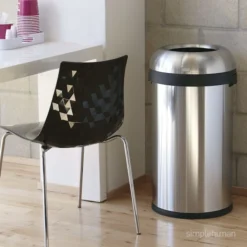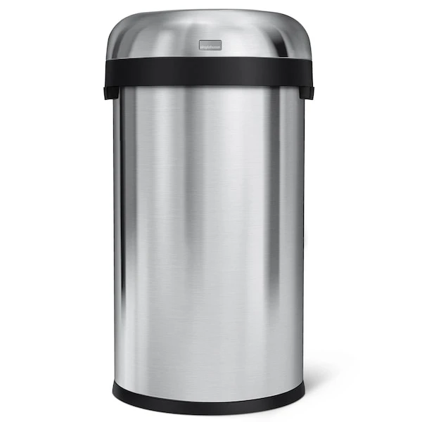 The simplehuman bullet open can has an open lid design that makes it easy to toss in trash on the go. The heavy-gauge stainless steel construction, lift-off lid, and large capacity make it an ideal choice for commercial spaces such as restaurants and coffee shops, or even busy families. ADA-compliant. The code P liner fits this can perfectly — no bunching or slipping for a cleaner trash experience.