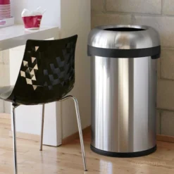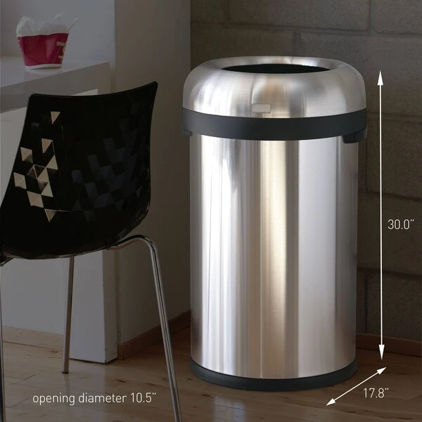The simplehuman bullet open can has a 10.5-inch opening that makes it easy to scrape food off trays or toss in large items like pizza boxes. The heavy-gauge stainless steel construction, lift-off lid, and extra-large capacity make it an ideal choice for high-traffic commercial spaces such as hotel lobbies, restaurants, and commissaries. ADA-compliant. The code X liner fits this can perfectly — no bunching or slipping for a cleaner trash experience.