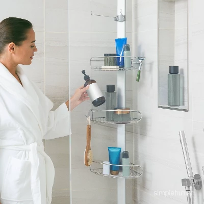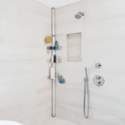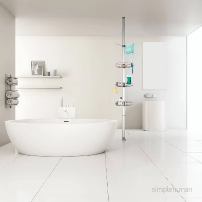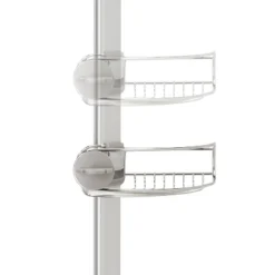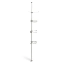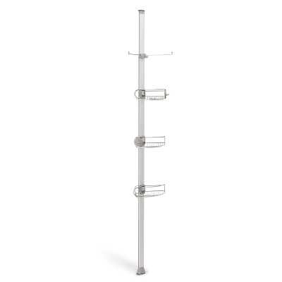 De-clutter your shower space! This stainless steel tension shower caddy provides a durable, space-efficient storage solution for virtually any shower or bath. It’s reinforced aluminum pole with high-compression spring fits securely between your floor and ceiling (extends 6 to 9 feet). Three adjustable wire-frame shelves slide up and down the aluminum pole to hold all your shower essentials. Made from completely corrosion-resistant materials.