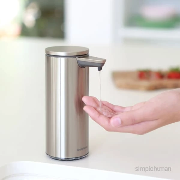 The simplehuman sensor pump is the most efficient way to wash your hands — no germs or smudges left behind. It has a clog-proof tubing pump that ensures a precise and consistent flow, and the silicone valve prevents messy drips. To control the amount of soap desired, you can position your hand up close to the sensor for a little soap and farther away for more. A funnel refill opening makes refills fast and easy, and it’s waterproof for easy cleaning. It recharges with the included charging puck — one charge lasts up to 3 months. Use simplehuman soap for optimum pump performance.