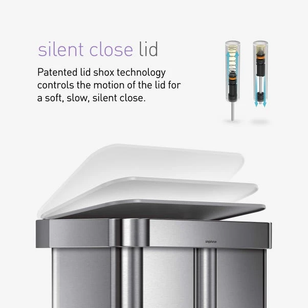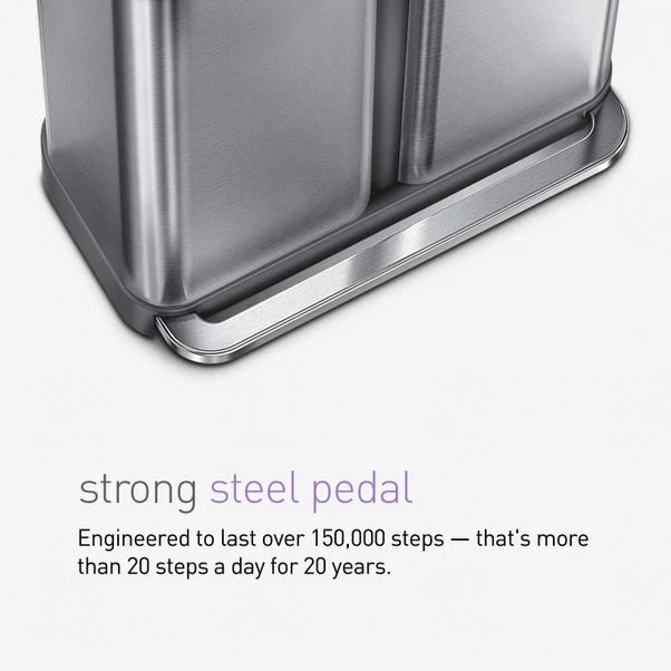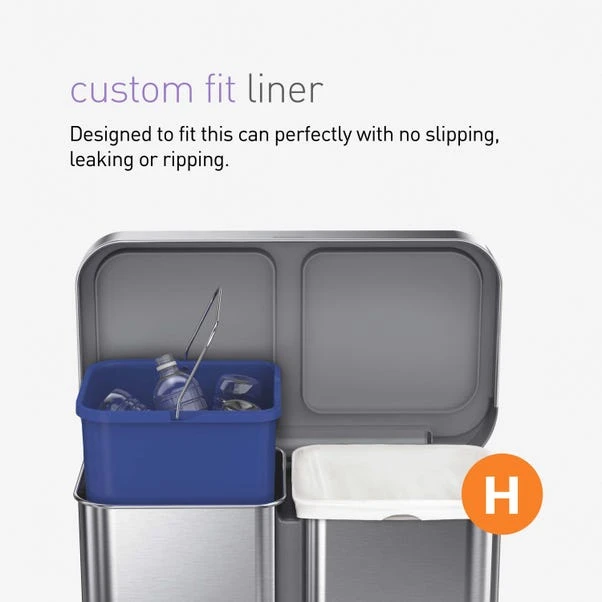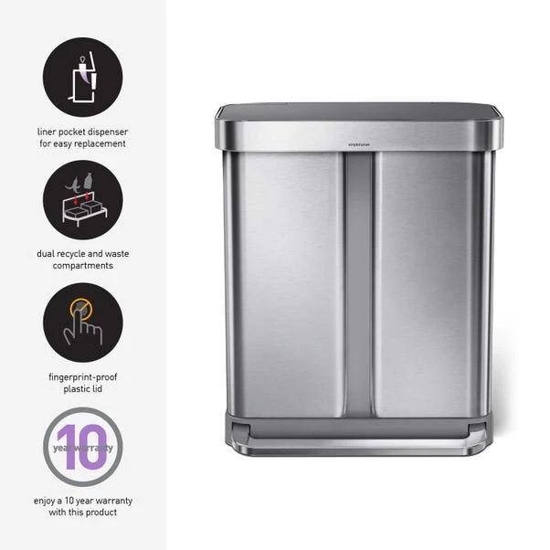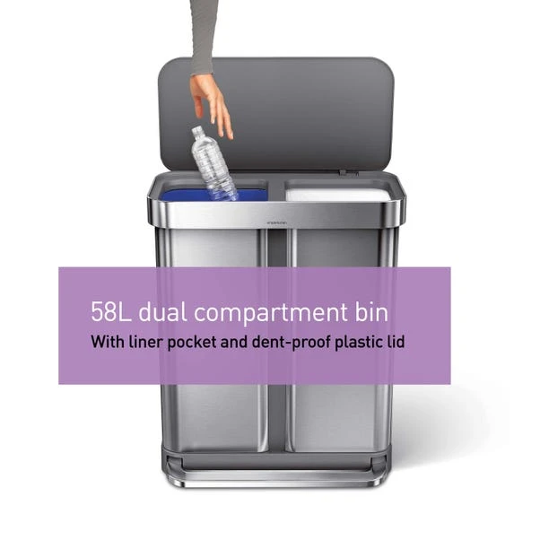 Simplify your recycling routine with the Simplehuman Dual Rectangle Pedal Bin 58L. Featuring dual compartments for trash and recyclables, this bin streamlines waste management. The innovative liner pocket and handled bucket make changing liners and disposing of recyclables a breeze. Plus, with a stainless steel surface resistant to fingerprints and germs, cleanliness is guaranteed.