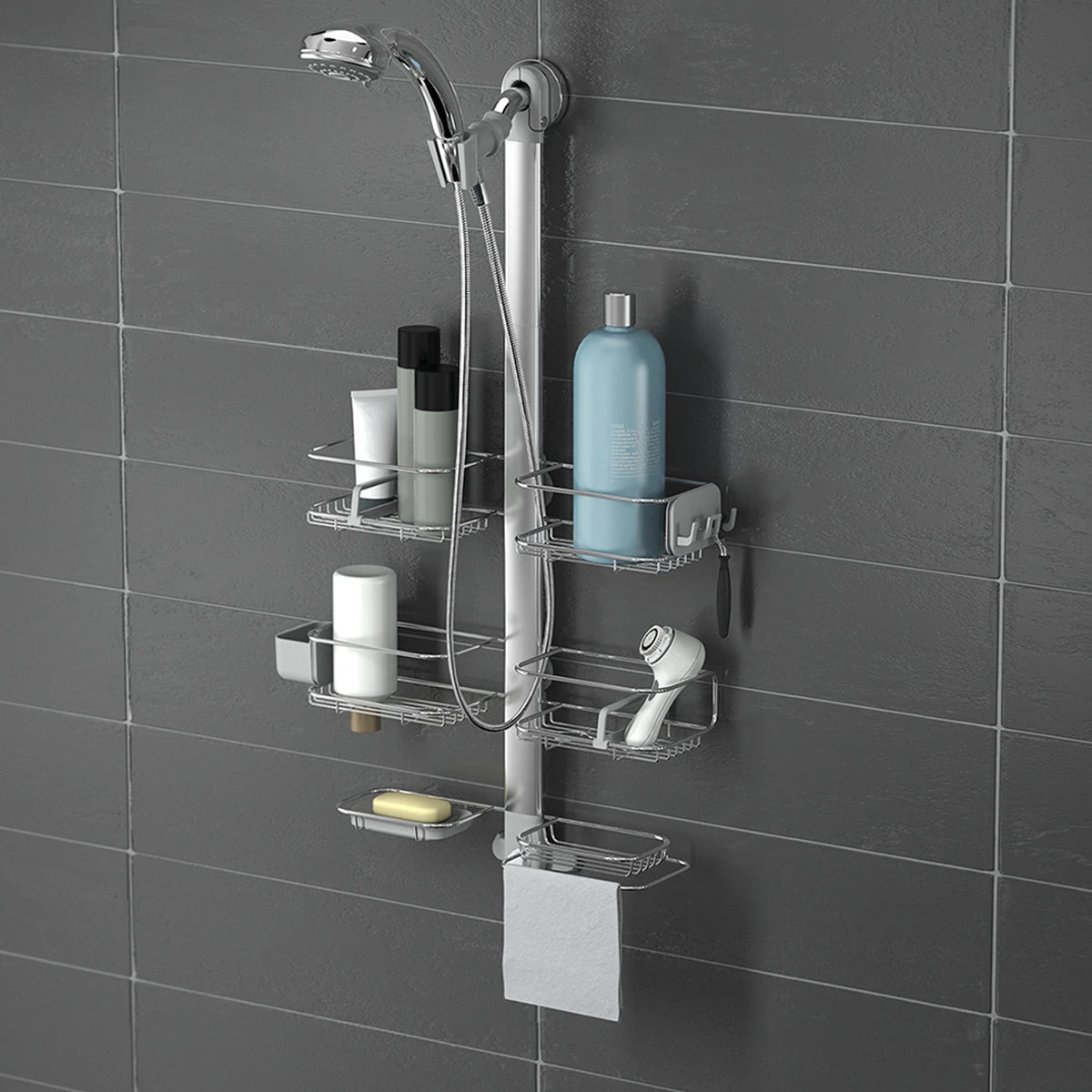 Specifically designed to be compatible with handheld showerheads, this caddy offers a family-size amount of shelf space. Wire frame shelves easily adjust up and down. Neck extends up to 12 inches to add clearance for tall bottles, which also lowers the caddy for easy access — even for kids. Innovative dividers and compartments are designed to hold bulky modern tools like facial cleansing brushes and oversized razors. Constructed from stainless steel and anodized aluminum so it is rust-proof and easy to clean.