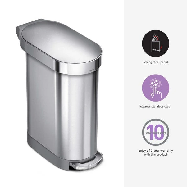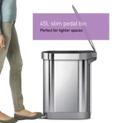 Offering a 45 litre capacity, this simplehuman slim pedal bin is designed with pedal operation for hygenic use, lid shox technology for quiet closing and a fingerprint-proof finish. Complete with a ten year guarantee, this sleek bin is complete with a brushed steel, fingerprint proof finish and is made from stainless steel for a durable finish.