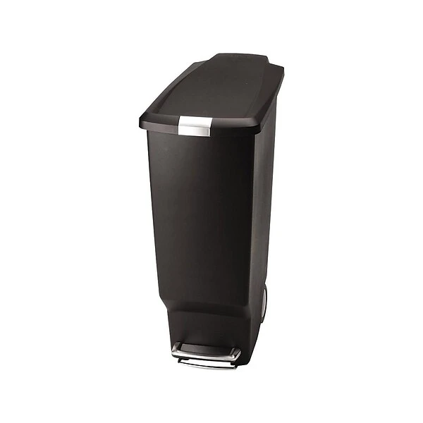 The simplehuman slim plastic step can has a space-efficient shape that fits perfectly in tight spaces, like between cabinets. The strong steel pedal is designed to last, and simplehuman’s patented lid shox technology ensures a smooth, silent close every time. A slide lock helps keep trash in and pets and curious children out. The simplehuman code K liner fits this can perfectly — no bunching or slipping for a cleaner trash experience.