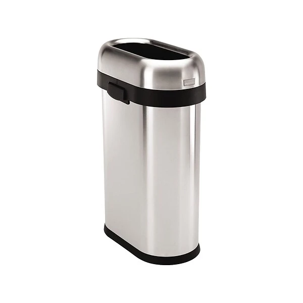 The simplehuman slim open can has a space-efficient shape designed for tight spaces, while its open lid makes it easy to toss in trash on the go. The heavy-gauge stainless steel construction, lift-off lid, and large capacity make it an ideal choice for for busy, high-traffic areas such as restaurants, coffee shops, and hotel lobbies. ADA-compliant. simplehuman code N liners fit this can perfectly — no bunching or slipping for a cleaner trash experience.