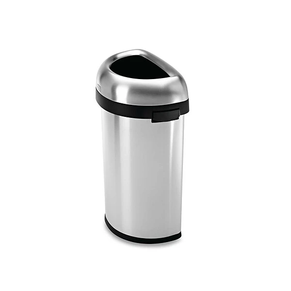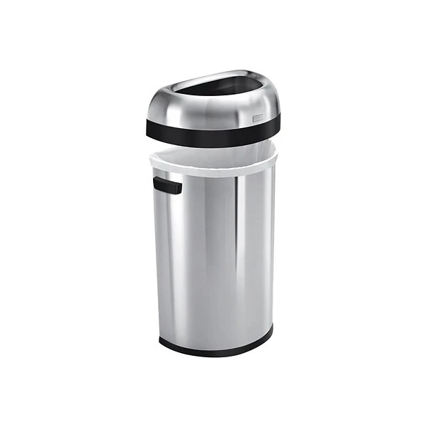 The simplehuman semi-round open can has a flat back for placement against the wall and out of the way, while its open lid design makes it easy to toss in trash on the go. The heavy-gauge stainless steel construction, lift-off lid, and large capacity make it an ideal choice for commercial spaces such as restaurants and coffee shops, or even busy families. ADA-compliant. simplehuman code P liners fit this can perfectly — no bunching or slipping for a cleaner trash experience.