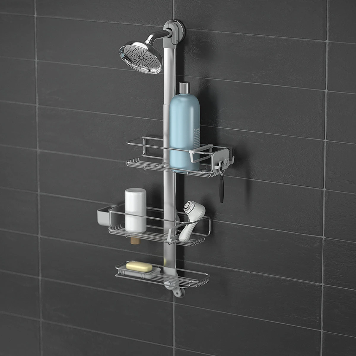 Wire frame shelves are fully adjustable and easy to reposition with quick-adjust dials. Neck extends up to 12 inches to add clearance for tall bottles, which also lowers the caddy for easy access — even for kids. Innovative dividers and compartments are designed to hold bulky modern tools like facial cleansing brushes and oversized razors. Quick-dry soap dish drains water completely so soap stays dry and lasts longer. Installation is secure and hassle-free. Constructed from stainless steel and anodized aluminum so it is rust-proof and easy to clean.