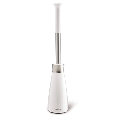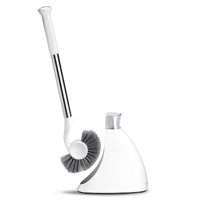 The simplehuman toilet brush has a specially designed crescent shape head reaches hard-to-clean areas around the rim. Unique magnetic collar secures the cover to the toilet brush so you can carry them together without any drips. Slim dome-shaped cover conveniently stores the toilet brush when not in use, keeping it hygienic and discreetly hidden.