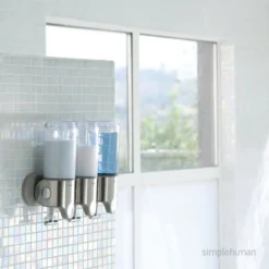 The simplehuman wall mount pumps eliminate bottle clutter from your shower and help keep everything you need within easy reach. The ergonomic t-bar lever works with your natural grip for precise, one-handed dispensing, and removable hooks hold a razor, loofah, or other accessories. Easy to install with double-sided tape.